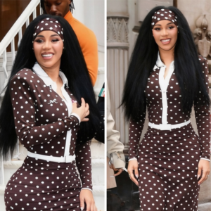 Cardi’s outfit struck a balance between sophistication and fun. She wore a brown-and-white polka-dot Rowen Rose polo maxi dress paired with matching stirrup leggings, white pointed-toe heels, and a coordinating headband.