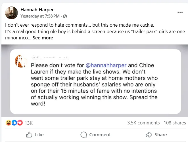 In the end, her message was simple: not every comment deserves a reaction — and sometimes the best response is just to laugh. And if the growing wave of support is any indication, Hannah Harper’s ability to handle the spotlight may be just as strong as her voice.